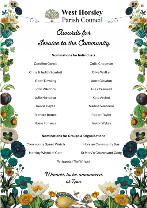 West Horsley Parish Council is delighted to launch its 2026 Awards for Service to the Community scheme to recognise individuals, groups and local organisations who have done exceptional work in our community, improving the lives of others, and fostering good relationships. The awards aim to recognise and encourage positive community working within the Parish of West Horsley.